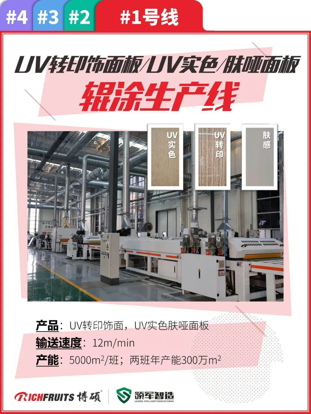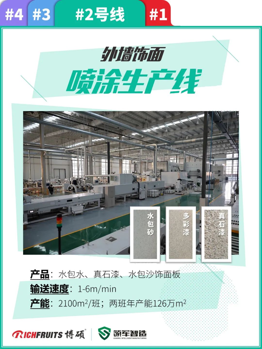 博碩涂裝一體化解決方案2.0的核心“整廠方案交付”;博碩交付領軍的主體由4條先進的生產線構成,制造UV轉印飾面板,UV實色和膚啞飾面板,水包水、真石漆、水包沙飾面板,平貼包覆飾面板,保溫材料等產品——