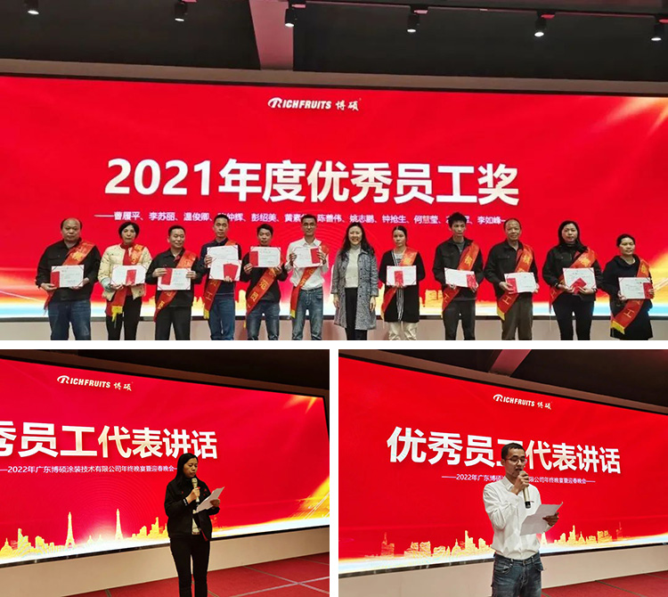 晚會伊始,博碩涂裝董事長謝君女士,向在場的以及因工作原因未能到現(xiàn)場的同事們送上誠摯的新年祝福語,同時也提出了2022年的關鍵詞:增長、組織、蛻變,希望博碩涂裝比此刻更好,希望每一個博碩人比此刻的自己更好,同時帶給客戶更好的體驗。