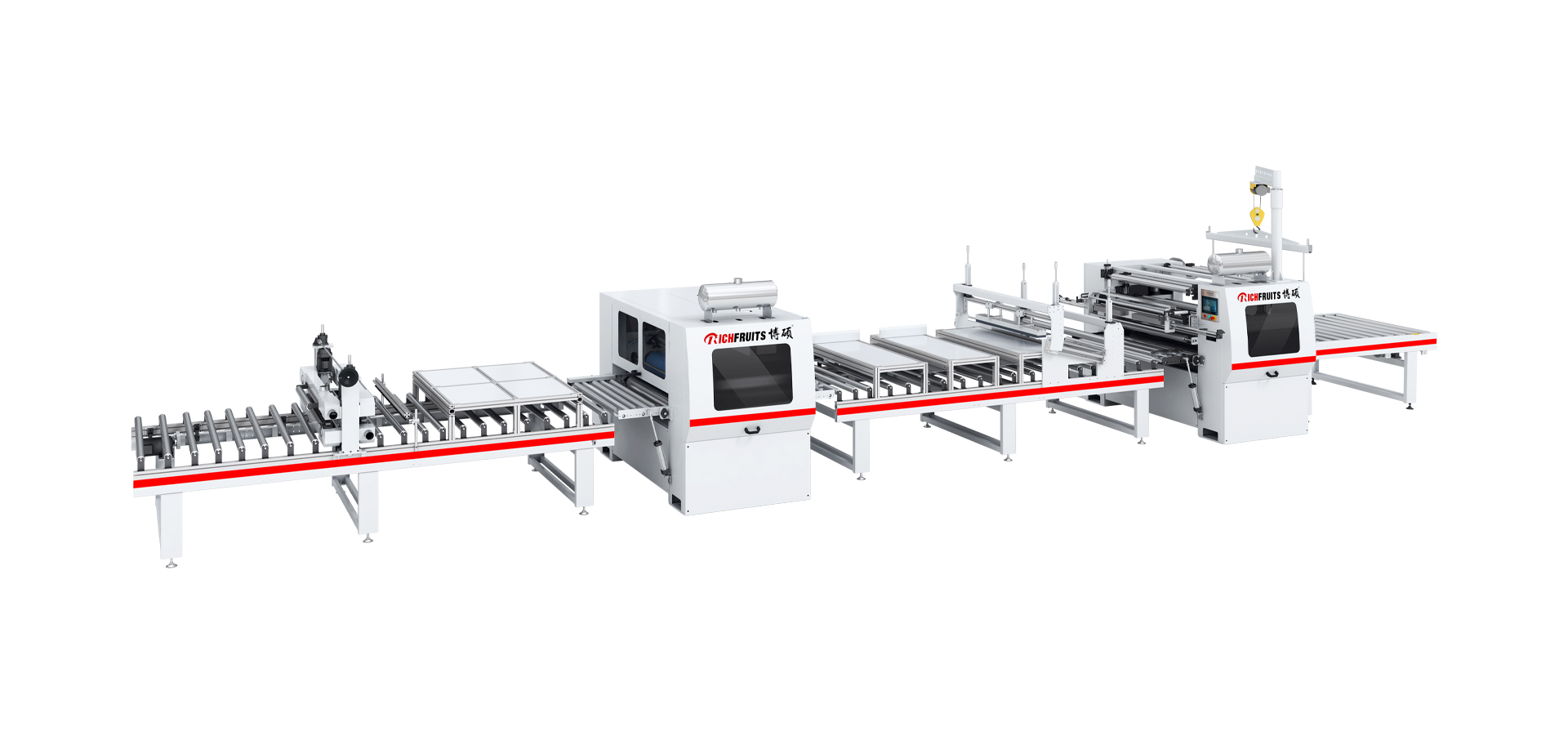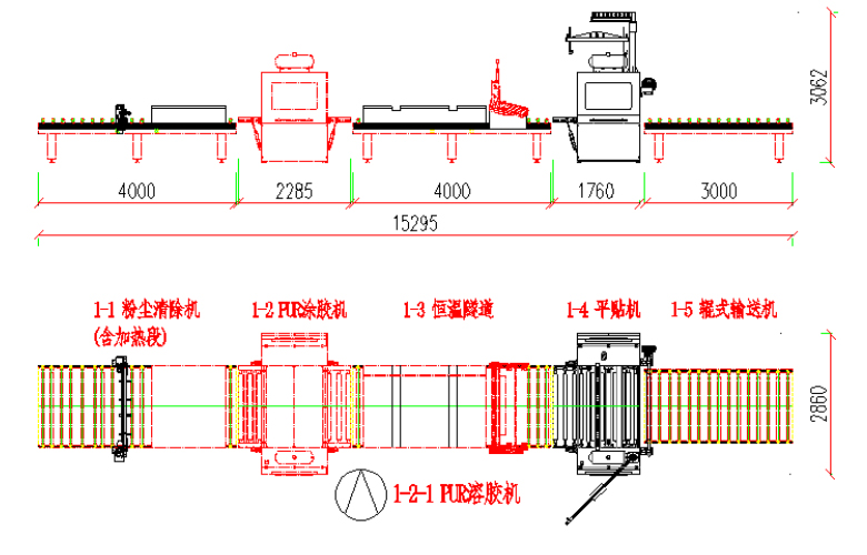 本生產(chǎn)線由:粉塵清除機(jī) — PUR涂膠機(jī)(含溶膠系統(tǒng)) — 恒溫隧道 — 平貼機(jī) — 輸送機(jī)等部分組成。