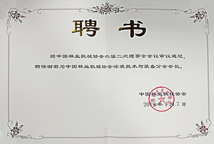 • 林機協(xié)會涂裝技術與裝備分會會長聘書