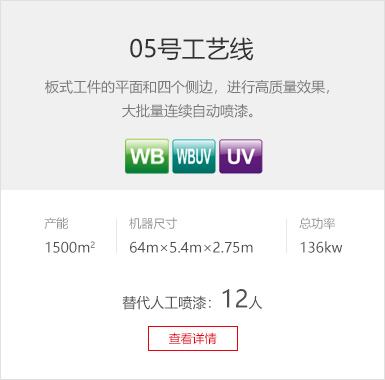 工藝要求 UV底漆、水性色漆、水性LED-UV面漆 產(chǎn)品種類 膜壓PVC櫥柜門板、定制衣柜、線條 產(chǎn)線數(shù)量 3條 設(shè)備特色 LED-UV固化系統(tǒng)、立體干燥房配2臺,待干1小時(shí) 生產(chǎn)產(chǎn)能 UV底漆噴涂線:1800m2/8h (生產(chǎn)員3人/線)
