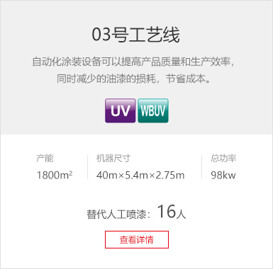 工藝要求 UV高光面漆 產(chǎn)品種類 酒店家具 產(chǎn)線數(shù)量 1條 設(shè)備特色 靜面流平隧道的使用,隔氧干燥的高質(zhì)量漆面效果。 生產(chǎn)產(chǎn)能 UV高光面漆噴涂線:1500m2/8h (生產(chǎn)員3人/線) 廢氣處理 干式過濾塔+光氧催化+活性碳 -