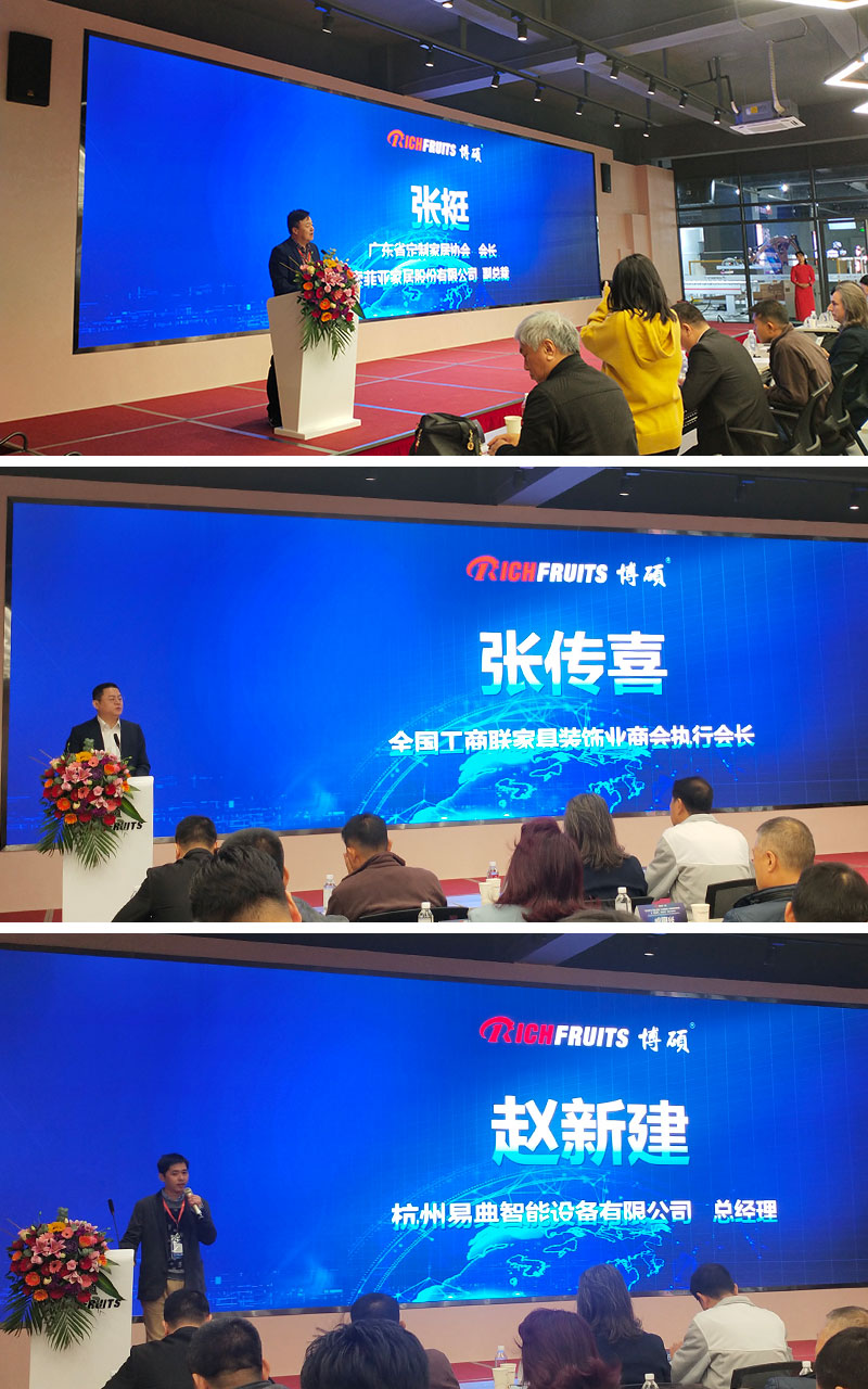 同時,廣東省定制家居協(xié)會會長索菲亞副總裁張挺、全國工商聯(lián)家具裝飾商會執(zhí)行會長張傳喜、杭州易典智能設(shè)備總經(jīng)理趙新建都為博碩涂裝一體化智能體驗館點贊!尤其索菲亞副總裁張挺張總高度贊揚了博碩的智能涂裝系統(tǒng),現(xiàn)國內(nèi)甚至是全世界最先進(jìn)的智能涂裝系統(tǒng)落地于蘭考索菲亞工廠。