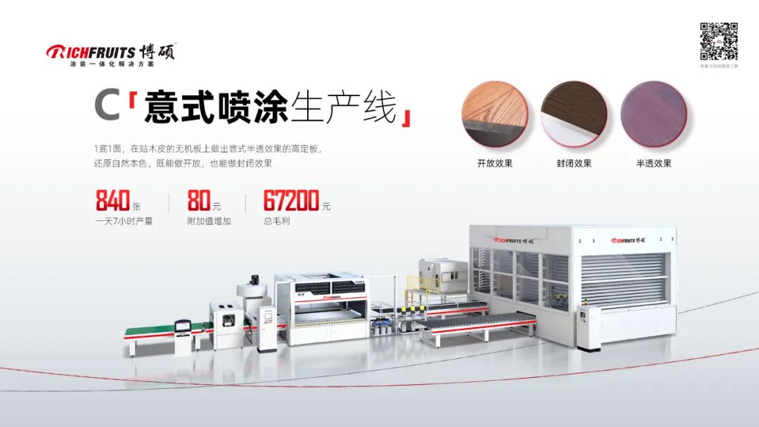 C線:在貼木皮的無機板上通過噴涂的方式做出意式半透效果的高定板,能夠還原自然本色,既能做開放,也能做封閉效果。這條線的最大特點:一鍵換色,一分鐘完成噴槍清洗,柔性化程度高,高定和批量工程都能通用。一天7小時產(chǎn)量是840張48尺板,每塊板的毛利大概是80元, 一天毛利是67200元。
