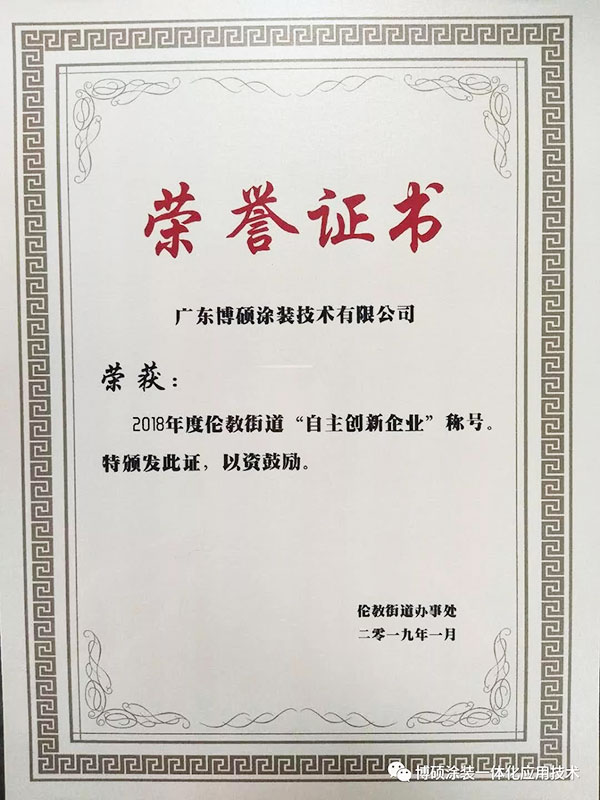 博碩榮獲“自主創(chuàng)新企業(yè)”稱號 會議期間,頒發(fā)了多個企業(yè)獎項! 本次獲獎的企業(yè)獎項:倫教交稅超億的6家,超3000萬的6家,超1000萬的21家,創(chuàng)新獎15家,廣東博碩涂裝技術(shù)有限公司,從倫教木工行業(yè)多家企業(yè)脫穎而出。 榮獲2018年度倫教街道“自主創(chuàng)新企業(yè)”稱號!