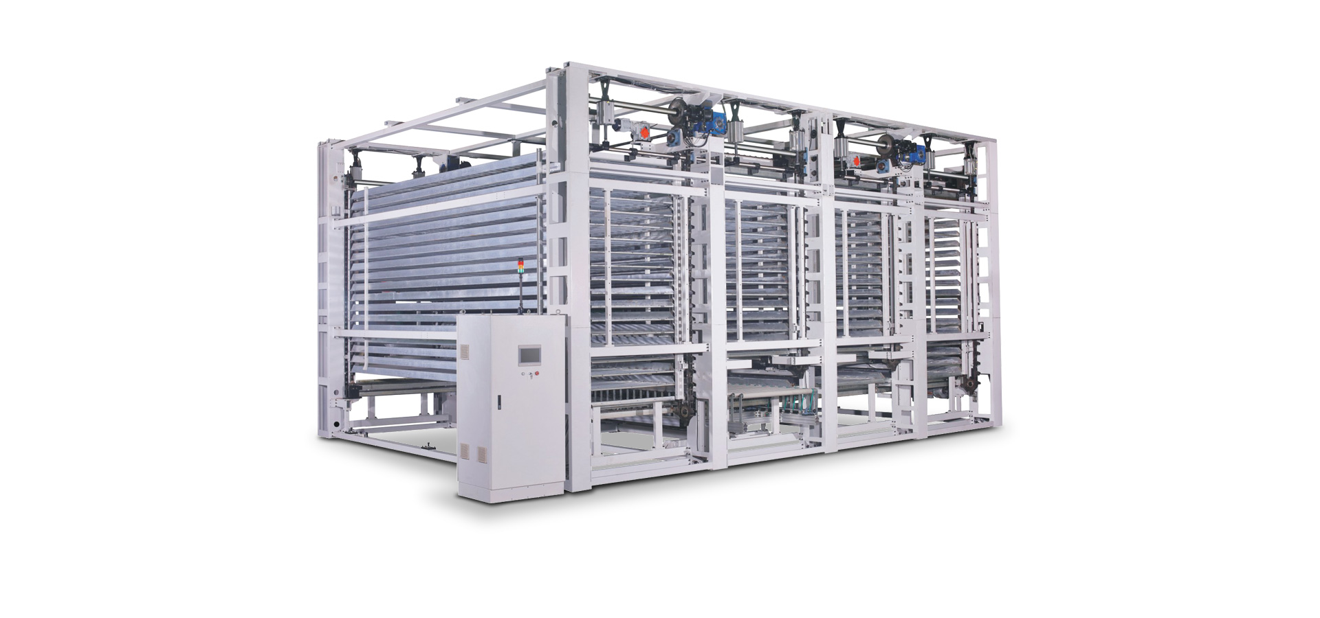 利用機(jī)器上部空間,采用立體式結(jié)構(gòu),適用于規(guī)格較為統(tǒng)一的實(shí)木家具、實(shí)木復(fù)合門、美式櫥柜、套房家具、衛(wèi)浴柜、展示柜、工藝品、裝飾板等板式工件,進(jìn)行自動(dòng)化噴漆后的長(zhǎng)時(shí)間(30~120分鐘)的待干,實(shí)現(xiàn)在線連續(xù)干燥作業(yè),噴漆后的長(zhǎng)時(shí)間待干能夠兼顧流平性、光滑性和漆膜干燥的性能。
