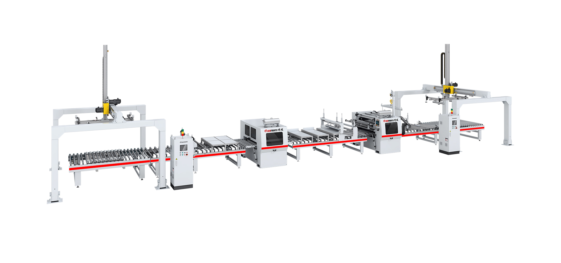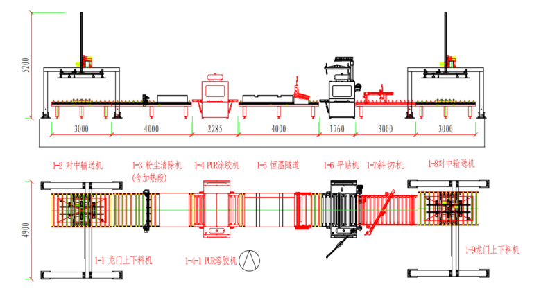 本生產(chǎn)線由:龍門上下料機 — 對中輸送機 — 粉塵清除機 — PUR涂膠機 — 恒溫隧道 — PUR平貼機 — 斜切機 — 對中輸送機 — 龍門上下料機等部分組成。