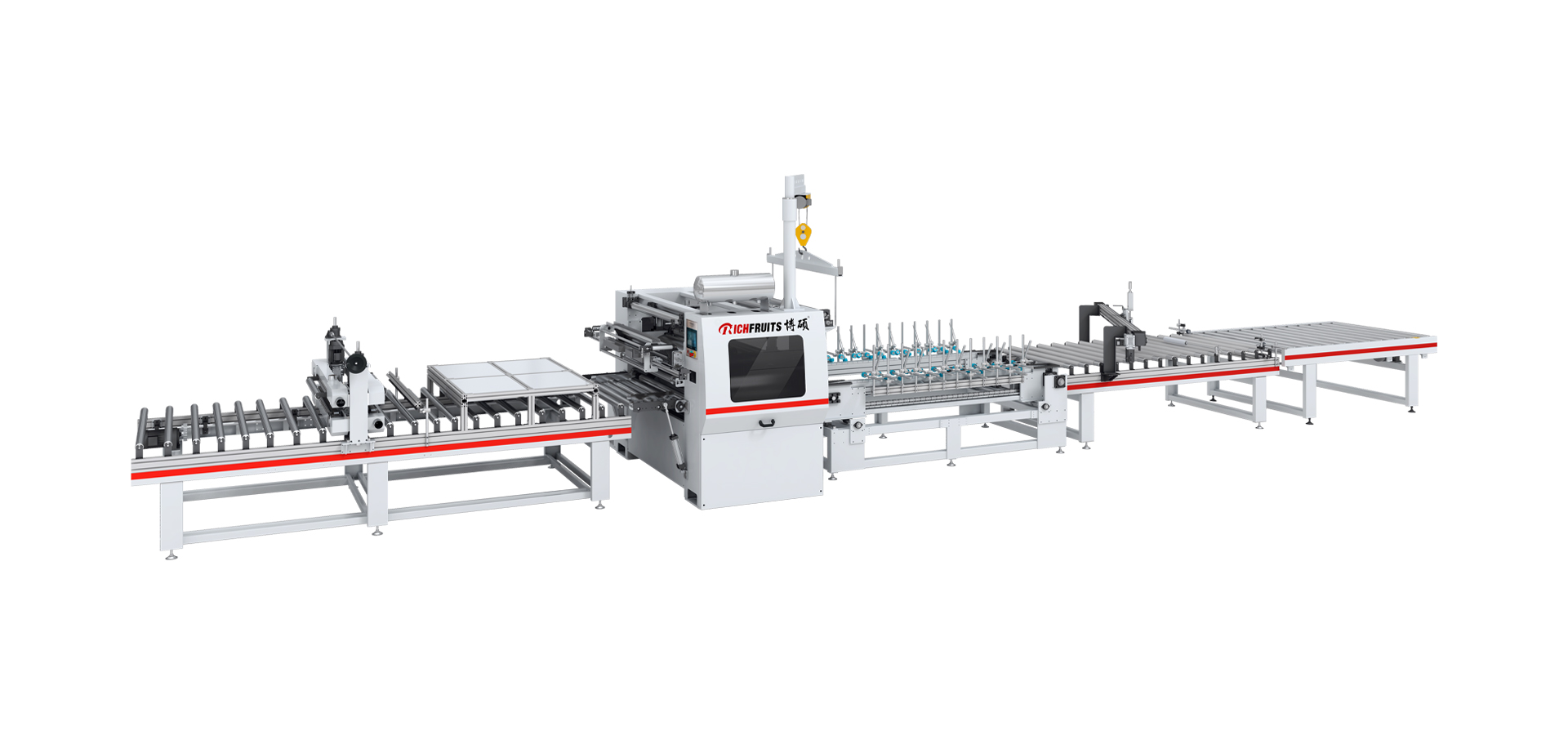 本生產線由:龍門上下料機 — 對中輸送機 — 粉塵清除機 — PUR涂膠機 — 恒溫隧道 — 平貼包覆機 — 斜切機 — 對中輸送機 — 龍門上下料機等部分組成。