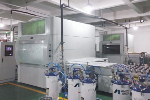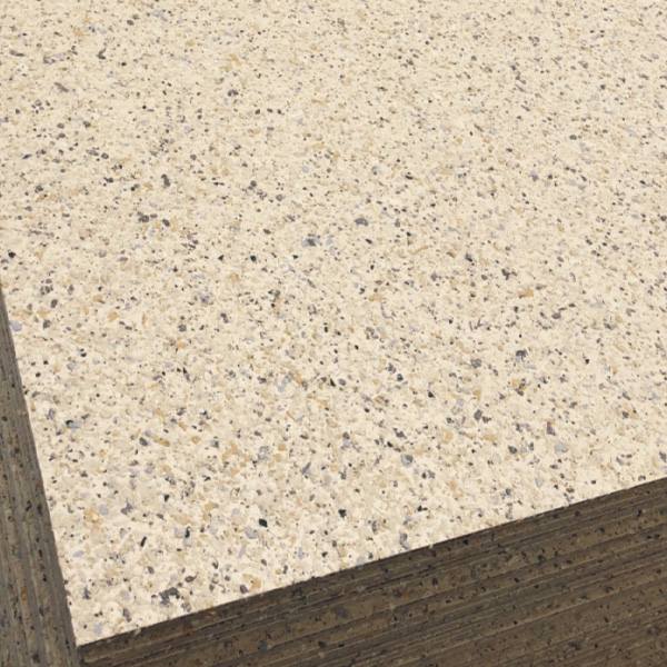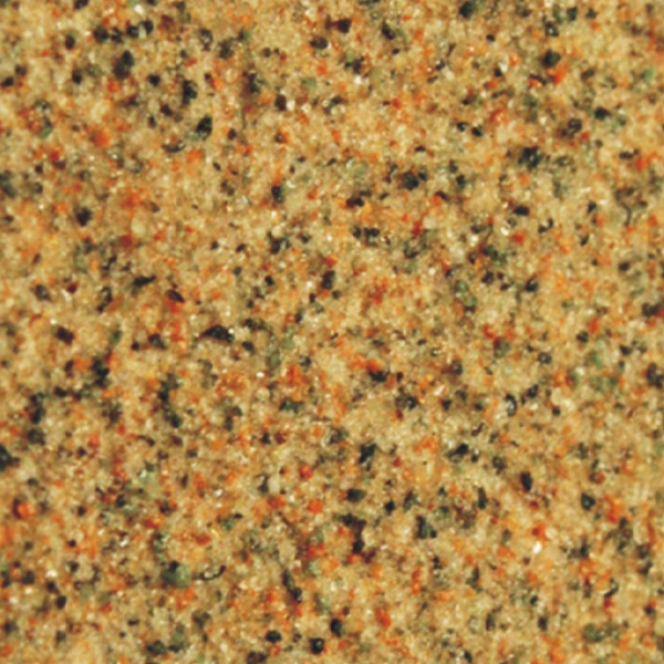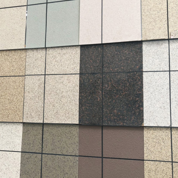 以中高密度纖維水性板/硅酸板為基材,通過砂光和多層水性漆輥涂,以及真石漆/水包砂噴涂,達到仿花崗巖的飾面效果,最后噴涂氟碳罩面,具有良好的自潔性能。真石漆/水包砂噴涂立體浮雕質(zhì)感面的效果,成本較低,并且具有良好的高低溫效果,非常適用于中低端墻面的裝飾要求。